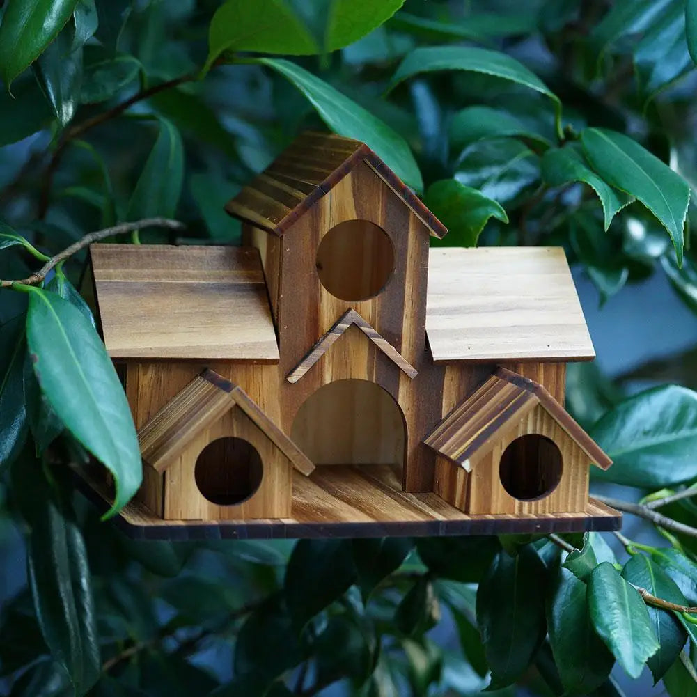 2.This brown outdoor 5 Hole bird house room is made of wood,It is waterproof and wear-resistant, which makes it last a long time..It is not affected by the sun, rain and other weather, it is designed for lasting outdoor decorative display.